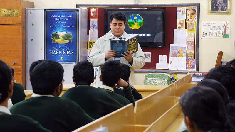 Rohit Sharma felolvas egy szabályt Az út a boldogsághozból a tanulóknak Újdelhi egyik iskolájának osztálytermében.